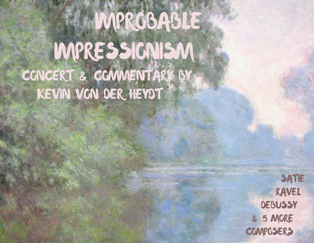 Posted on August 16, 2010September 20, 2023 by plaincabImprobable Impressionism Improbable Impressionism concert & commentary by Kevin von der Heydt piano Download: Concert Program